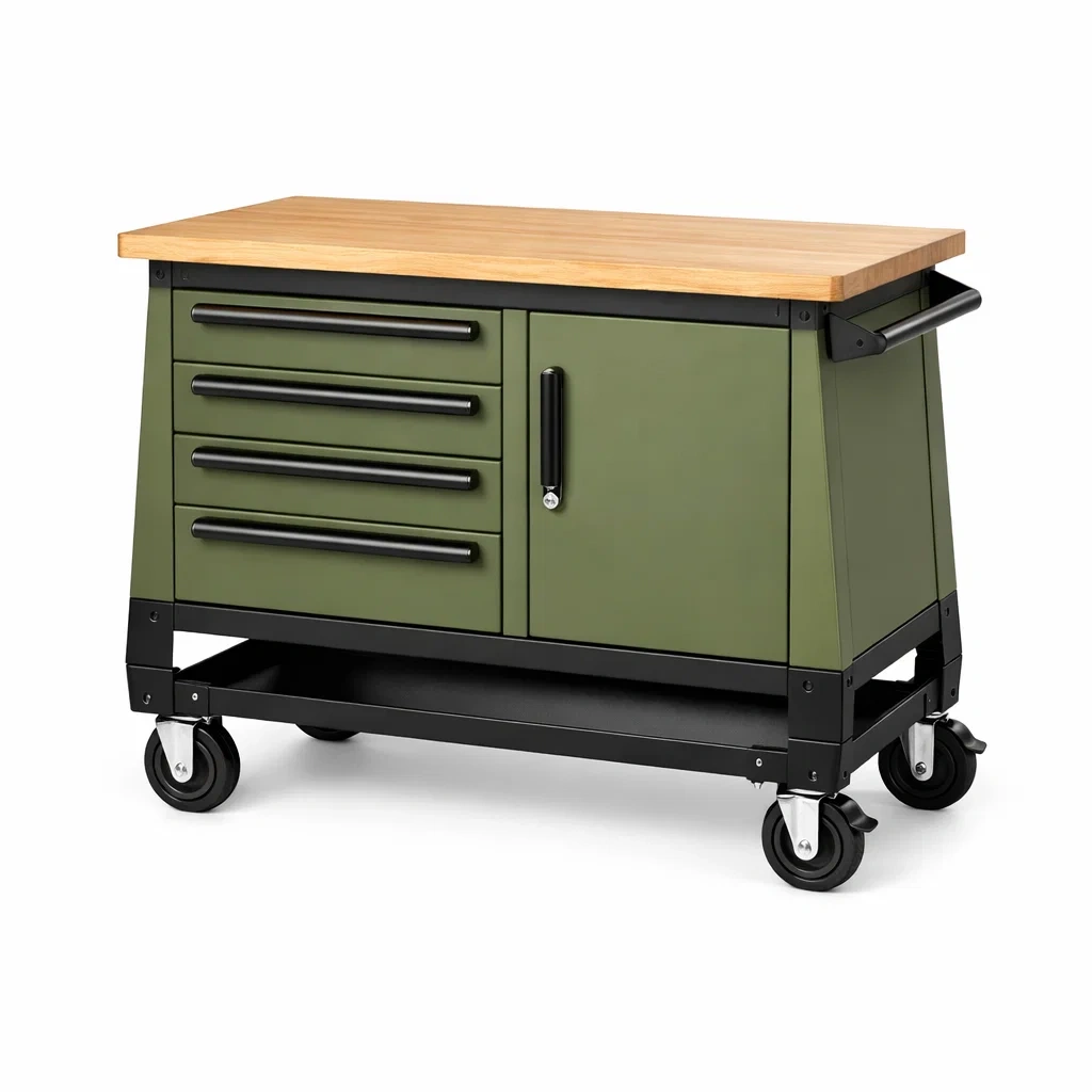 Ce chariot à outils se compose d'une structure en acier et d'un plateau en bois massif. Les roulettes en caoutchouc facilitent le déplacement. Il est équipé de quatre tiroirs et d'une porte pour un rangement optimal. Dimensions: 120 cm de longueur, 60 cm de largeur et 90 cm de hauteur.