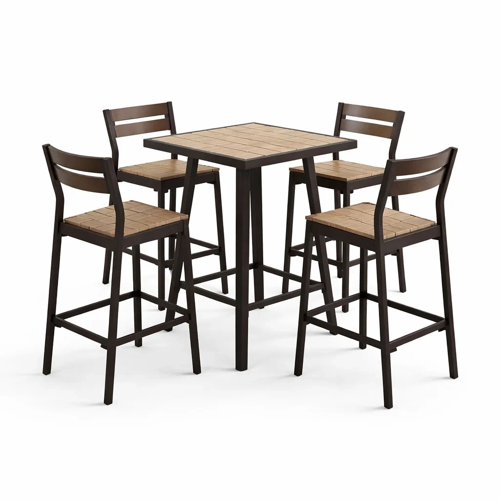 Ensemble comprenant une table haute et quatre tabourets de bar conçus en métal et bois. La structure en métal assure une robustesse optimale, tandis que les sièges et plateau en bois apportent une touche naturelle. La table et les tabourets sont adaptés pour un usage intérieur ou extérieur.
